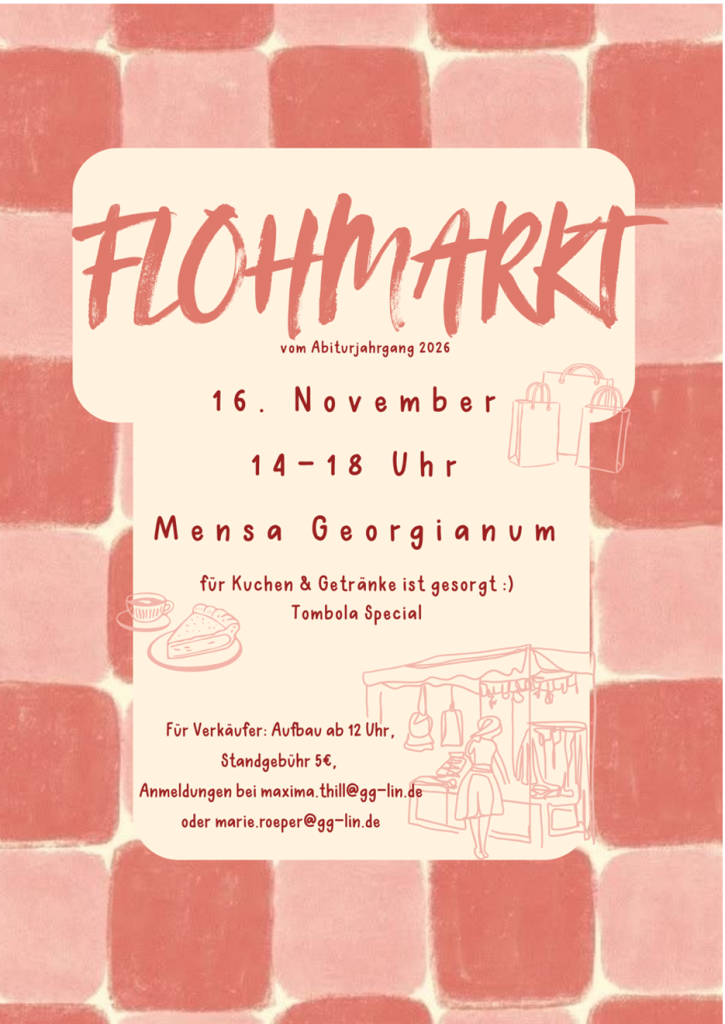 Am Sonntag, den 16.11., von 14-18 Uhr verwandelt sich unsere Mensa in einen Schulflohmarkt. Ob coole Klamotten, Spiele, Bücher oder eine Tombola – hier gibt’s für alle etwas zu entdecken. Für Verpflegung ist natürlich auch gesorgt:) Der Aufbau für Verkäufer startet ab 12 Uhr und die Standgebühr beträgt 5€ – Anmeldung per Mail an maxima.thill@gg-lin.de oder marie.roeper@gg-lin.de