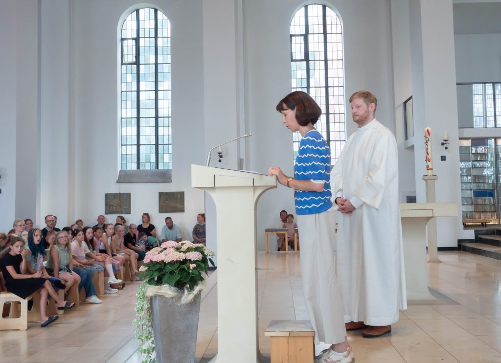 Frau Sander, die mit Frau Kurnei und Frau Nottbeck den gelungenen und ansprechenden Wortgottesdienst vorbereitete, dürfte in ihrer kurzen Ansprache aus den Herzen der Jung-Georgianer gesprochen haben, als sie das Thema der Feier vorstellte: „Ich möchte, dass einer mit mir geht.“ Denn es sei – so stellte sie fest – besonders wichtig, am Tag der Einschulung nicht allein zu sein. Deshalb habe das Vorbereitungsteam Schüler aus dem sechsten Jahrgang gebeten, ihre Gedanken und Ängste vom ihrem Schulstart sowie ihre Erfahrungen aus ihrem ersten Jahr am Georgianum aufzuschreiben und vorzutragen, um ihren neuen Mitschülern Mut zu machen.