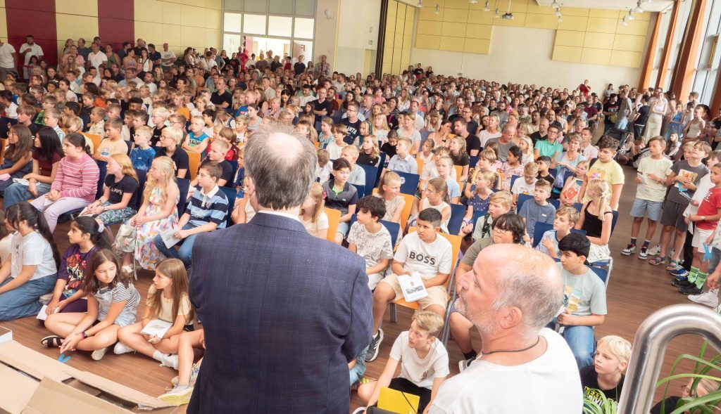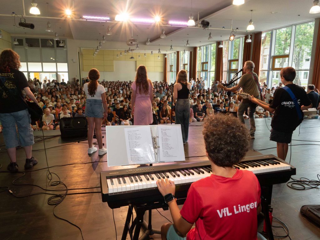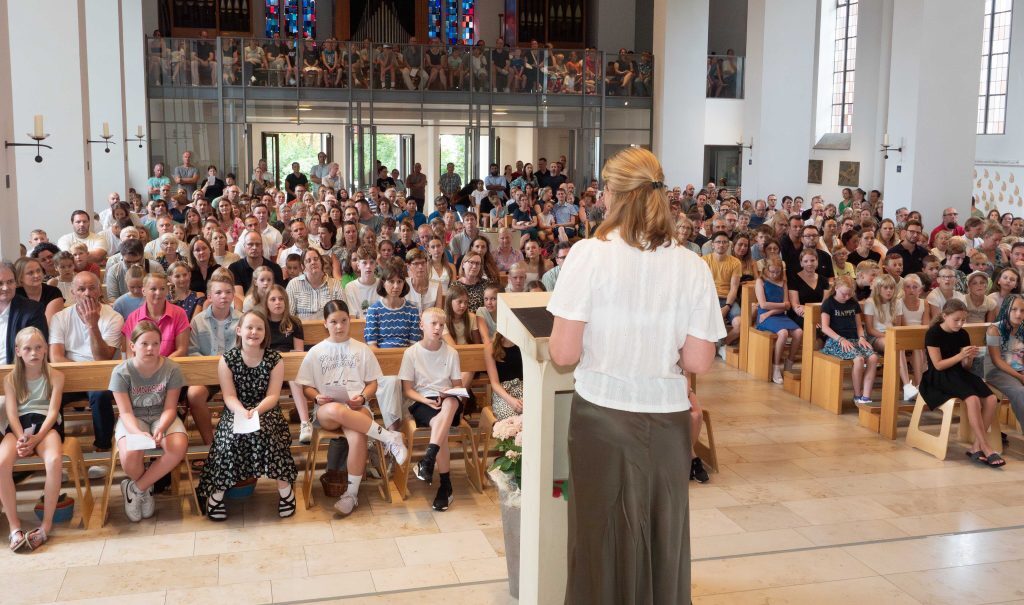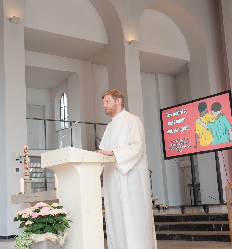 Zusammen mit ihren Eltern und Großeltern, Paten und Geschwistern begann für über 180 neue Fünftklässler unserer Schule am 15. August 2025 mit dem Eintritt in unsere Schulgemeinschaft ein neuer Lebensabschnitt. Wie es schon zur guten Tradition am Georgianum gehört, startete die Einschulung zunächst mit einem ökumenischen Wortgottesdienst in der Maria Königin Kirche und endete schließlich mit einem gemeinsamen Treffen der neuen Mitschüler in den einzelnen Klassenräumen.