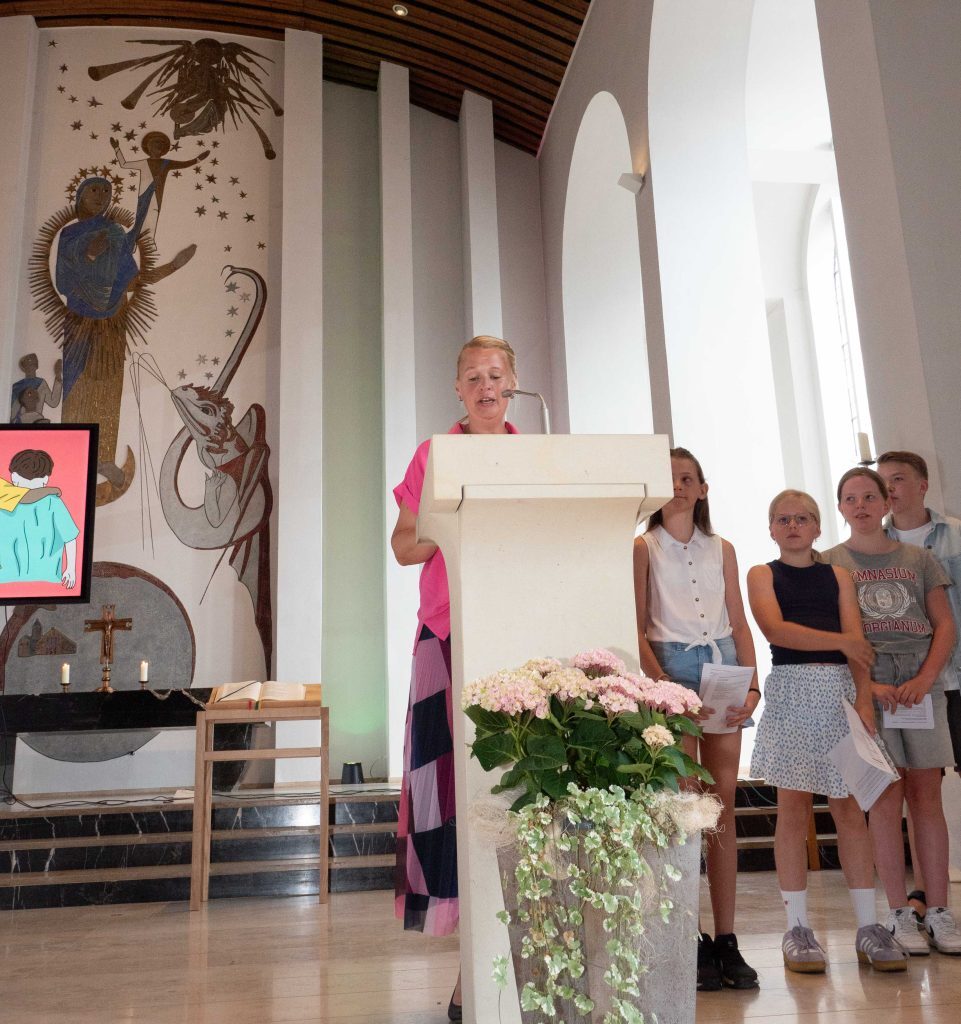 Stellvertretend für die neuen Schüler:innen des Georgianums formulierten die Sechstklässler Jost, Marta, Leni, Anneke, Theresa und Clara Fürbitten. Sie baten Gott darum, die Neuankömmlinge auf ihren Weg weiter zu begleiten, ihnen Mut und Freude am Lernen zu schenken, ihnen viele neue Freunde finden zu lassen, und dass sie in Frieden und Gerechtigkeit aufwachsen könnten.