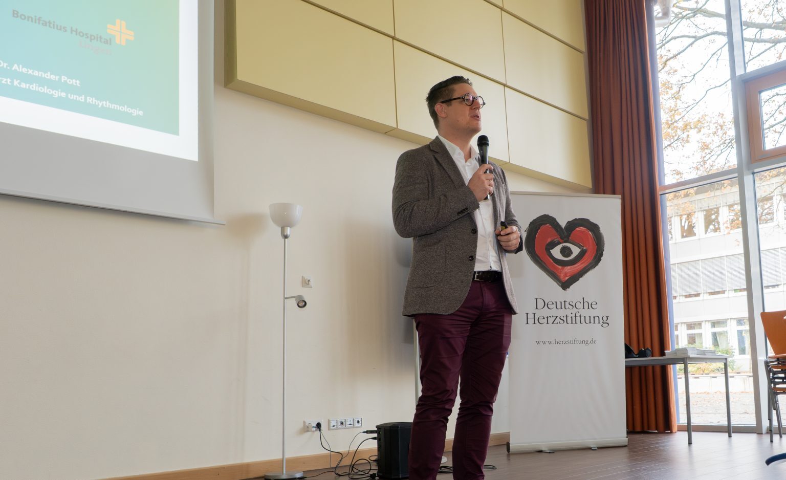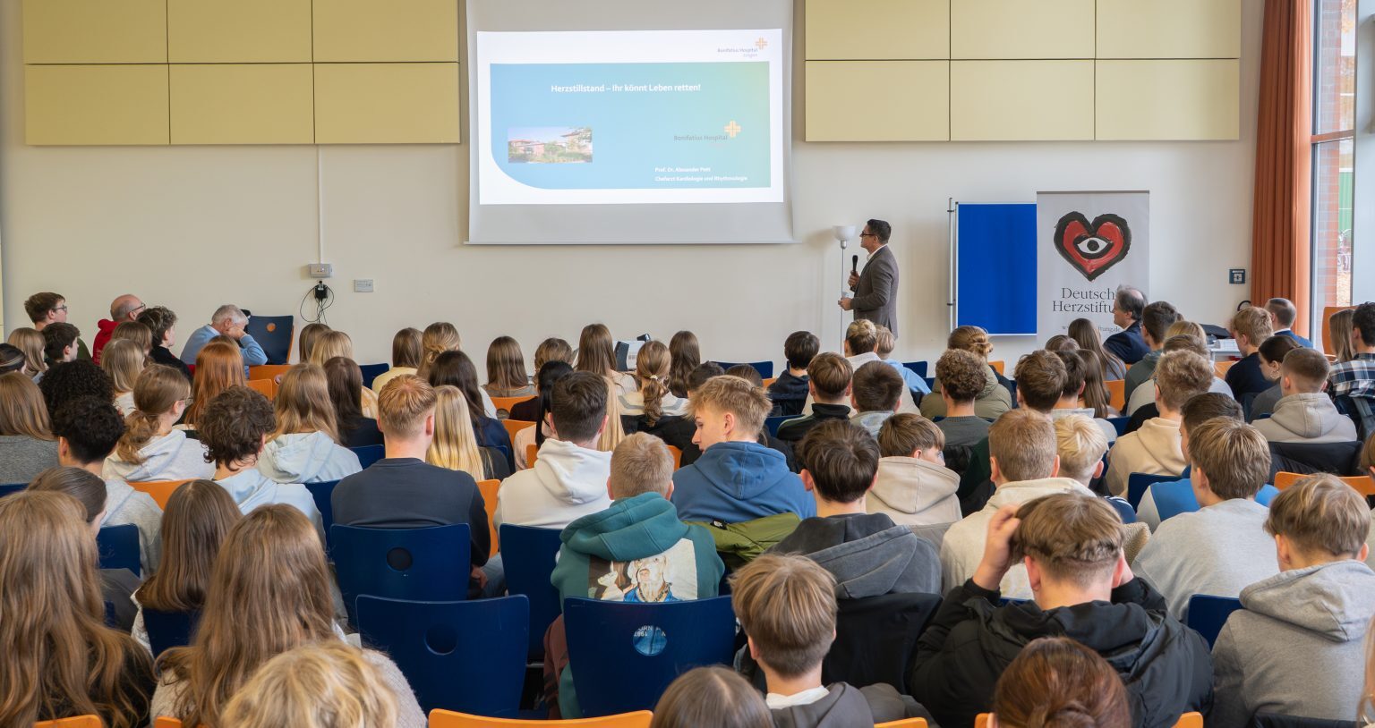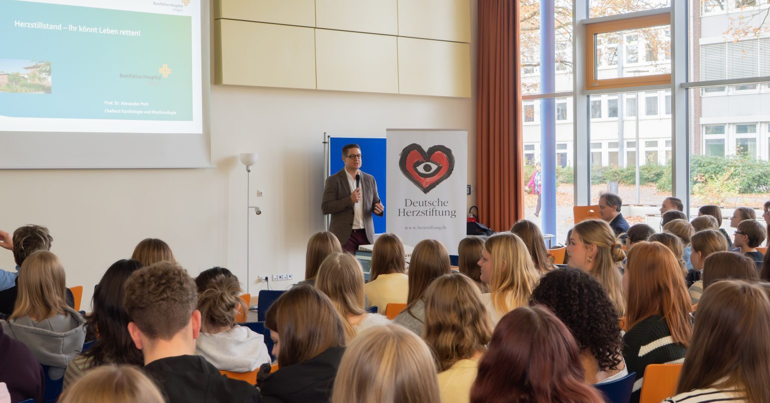 Herr Prof Dr. Alexander Pott, Chefarzt der Kardiologie am Bonifatius Krankenhaus in Lingen, eröffnet das Projekt „Herzensretter Bronze“ am Gymnasium Georgianum Lingen, welches unter der Schirmherrschaft der Deutschen Herzstiftung und in Kooperation mit der DLRG, Ortsgruppe Lingen, in der Praxis umgesetzt wird.
