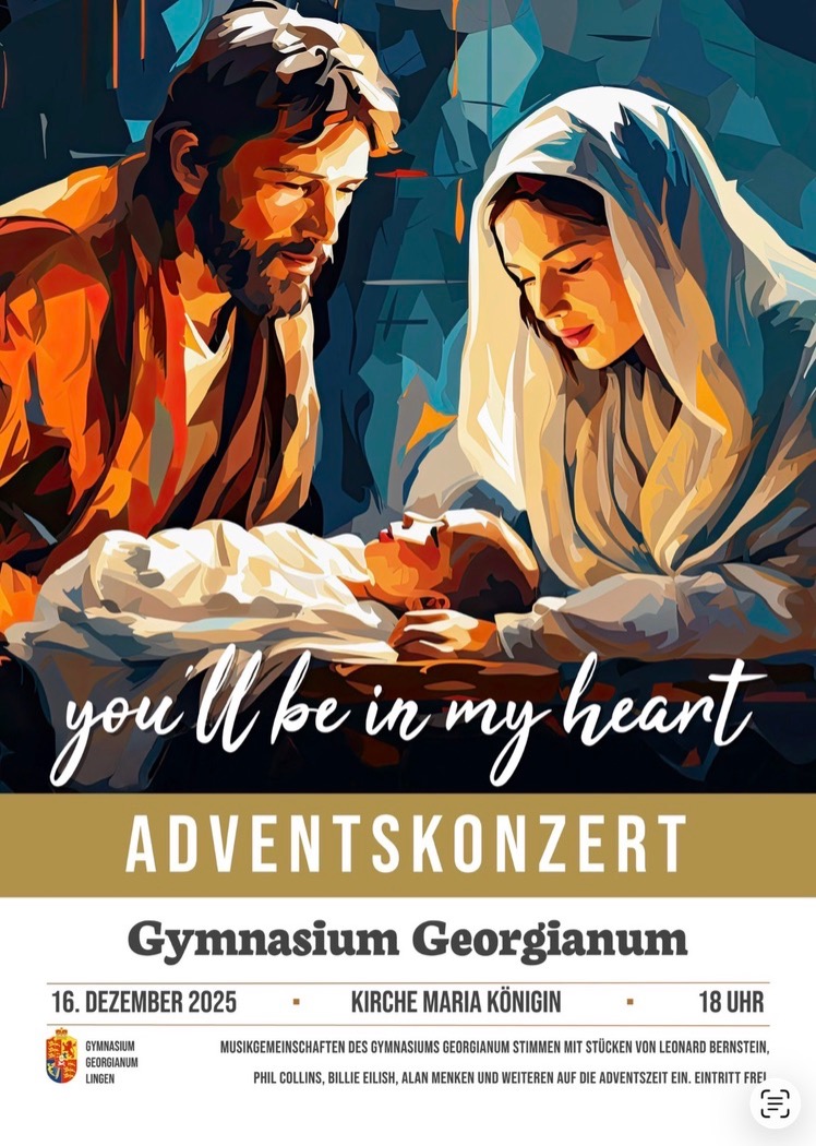 Die Fachgruppe Musik freut sich gemeinsam mit allen Mitwirkenden, euch am Dienstag, den 16.12.2024, um 18 Uhr zu unserem Adventskonzert unter dem Motto „You’ll Be in My Heart“ in der Kirche Maria Königin begrüßen zu dürfen. Unsere Chöre, Orchester, Bands sowie Solistinnen und Solisten haben ein vielfältiges und stimmungsvolles Programm vorbereitet, das euch auf die Weihnachtszeit einstimmen und einen besonderen Abend schenken soll. Wir freuen uns sehr darauf, diesen musikalischen Moment mit euch zu teilen!