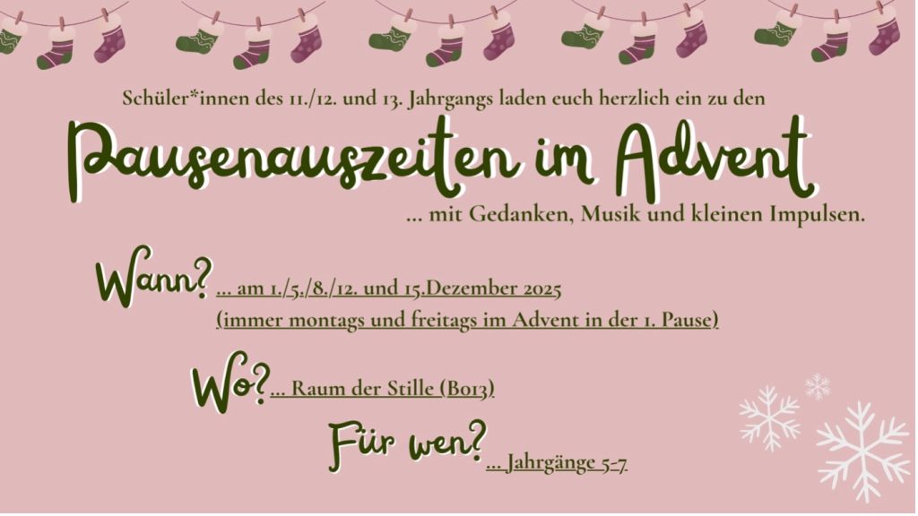 Aus dieser Beobachtung heraus motiviert bereiten Schülerinnen und Schüler der Jahrgänge 11, 12 und 13 für jüngere Schülerinnen und Schüler der Jahrgänge 5 bis 7 die „Pausenauszeiten im Advent“ vor – kleine Ruhepunkte im Alltag mit Geschichten, Liedern, kleinen Videos und Aktionen rund um die Adventszeit.