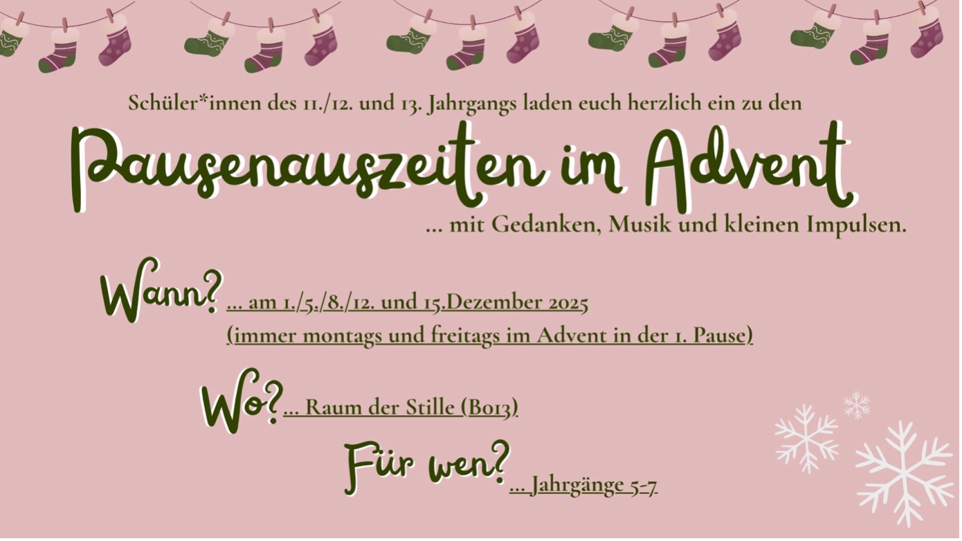 Die Pausenauszeiten finden immer montags und freitags in der Adventszeit in der ersten großen Pause im Raum der Stille (B013) statt.