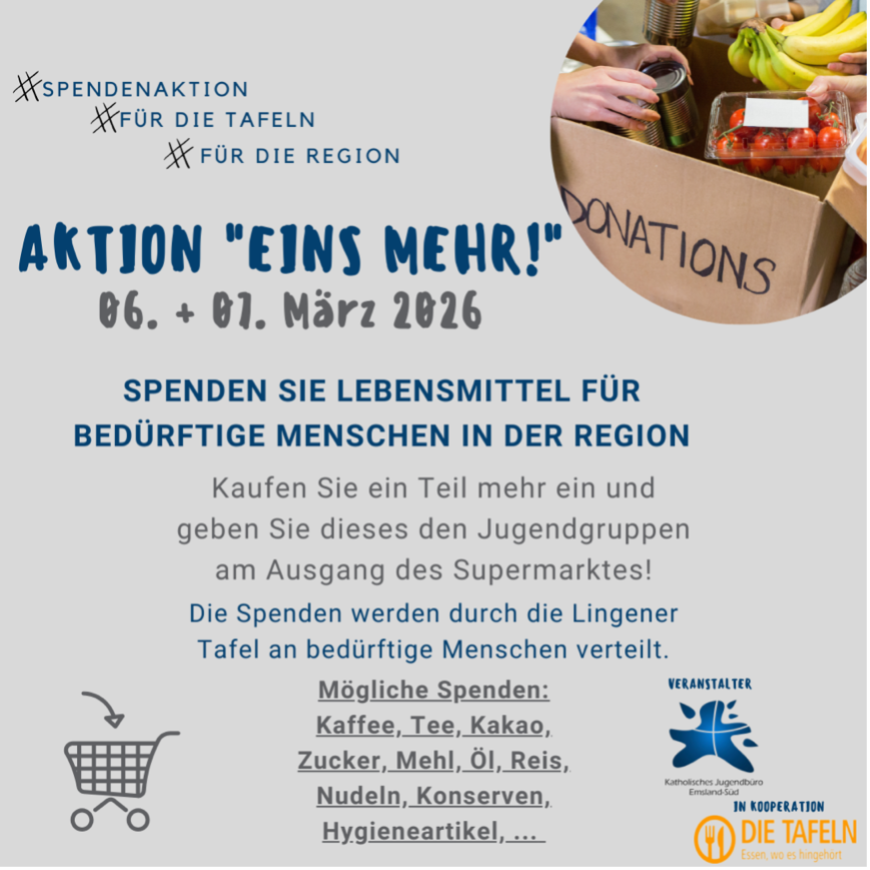 In Kooperation mit dem Katholischen Jugendbüro Emsland-Süd und der Lingener Tafel gestalten Schüler:innen des Schülpastoral-Teams aus dem Jahrgang 12 gemeinsam mit Schüler:innen der Klasse 6c die Aktion „Eins mehr!“ mit.