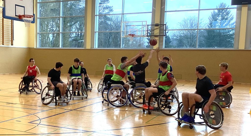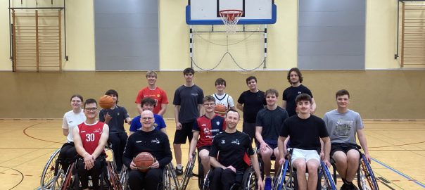 In einer besonderen Sportstunde wurde den Schülerinnen und Schülern des 13er-Sportkurses Basketball (KAU) erst der Umgang mit dem Rollstuhl und dann mit dem Rollstuhl und dem Ball anhand von vielen Übungen gezeigt, die allen großen Spaß bereitet haben.