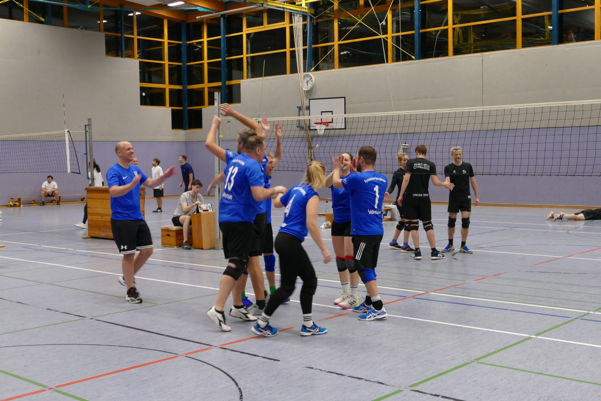 Von dort an kamen alle besser ins Spiel. Die Taktikänderung von Coach und Spielerin Jennifer Beel auf das Beibehalten der Positionen und das alleinige Zuspielen von Beel zeigten Wirkung. Dazu kamen mehr Motivation, positives Miteinander und jede Menge Spaß. Das konnte nur gutgehen 😉. Im Viertelfinale, wo das erste Mal ohne Zeitdruck ein echter Satz bis 15 gespielt wurde, gewann das Georgianum mit 15:11 gegen das Leoninum aus Handrup. Im Halbfinale konnte sich das Georgianum in einem Nervenkrimi mit 20:18 gegen die Friedenschule durchsetzen und währte schon mehrere Matchbälle ab. Die Spannung war zwischenzeitlich am Siedepunkt. Das Georgianum war Nervenstark und feierte den Einzug ins Finale. Dort wartete das Franziskusgymnasium I. Es war Julia Krey, die zur Bestform auflief und nach einen 4:6-Rückstand im zweiten Satz mit einer Aufschlagserie auf 13:6 stellte und damit den Weg für den Zwei-Satz-Sieg frei machte. Im ersten Satz überzeugten alle auf ganzer Linie, der mit 15:11 gewonnen werden konnte. Vor allem die präzisen Zuspiele und die vielen Angriffsschläge zeigten ab den KO-Spielen ihre Wirkung. Das Georgianum kam zurück und gab sich nie auf!