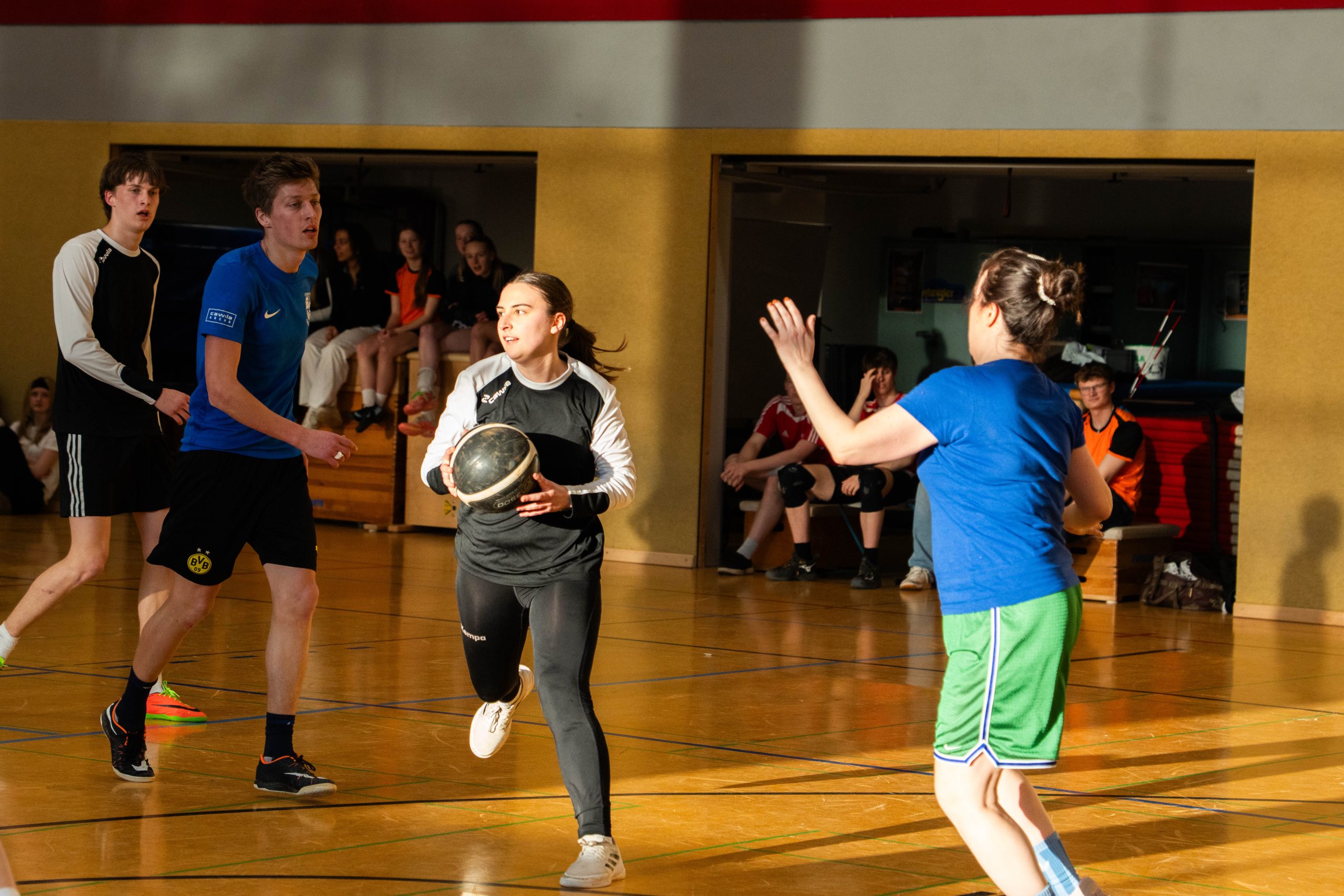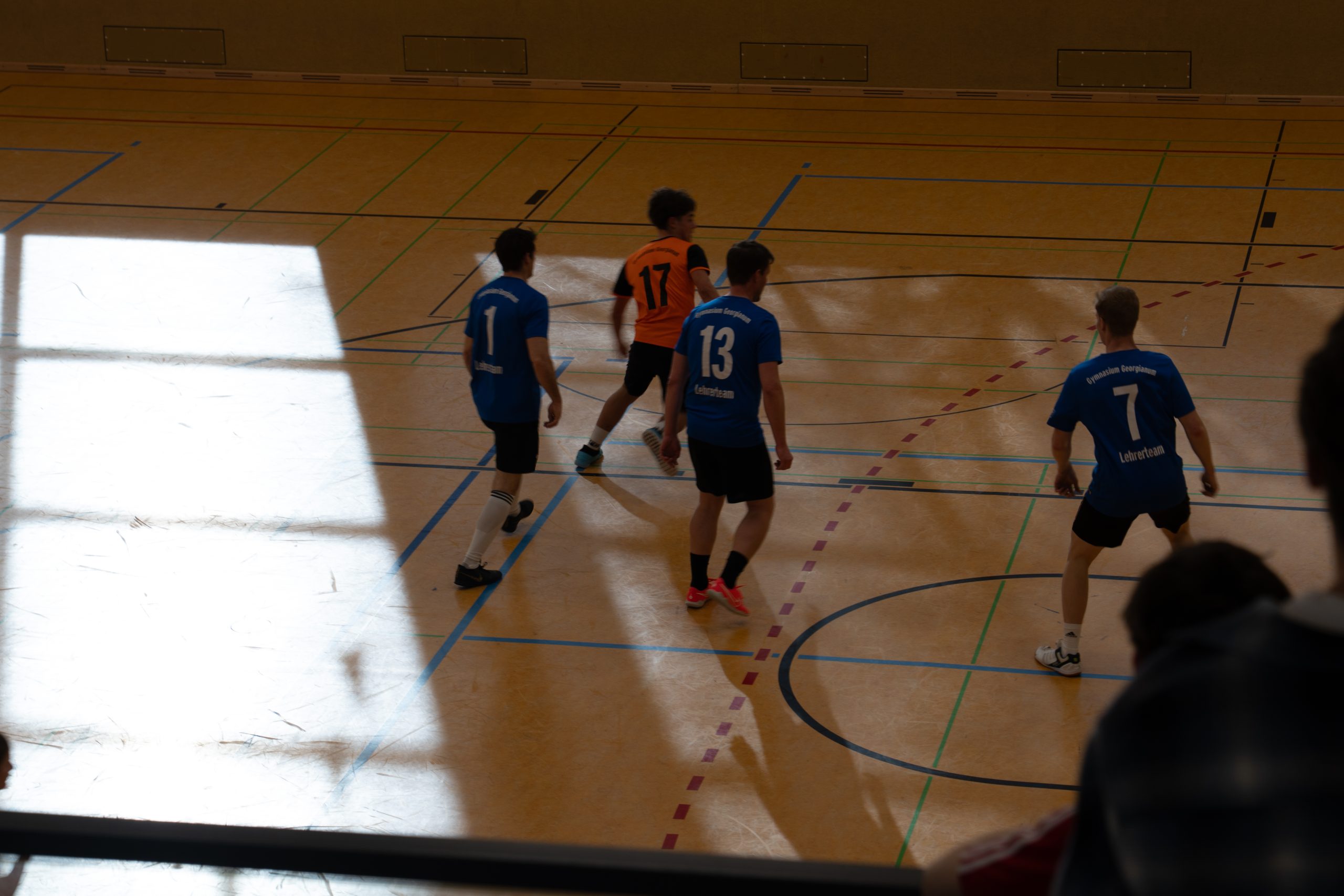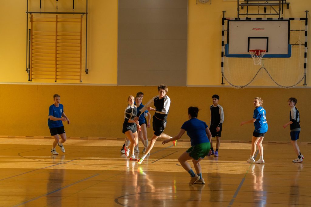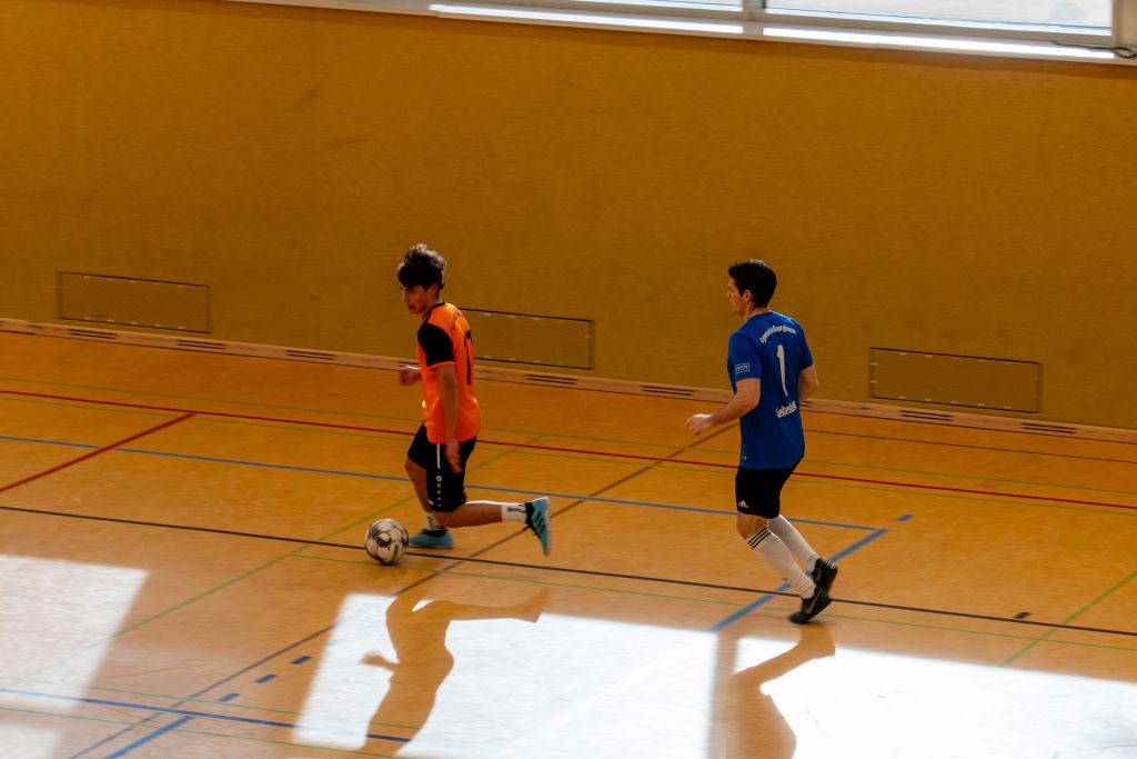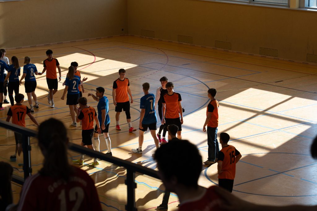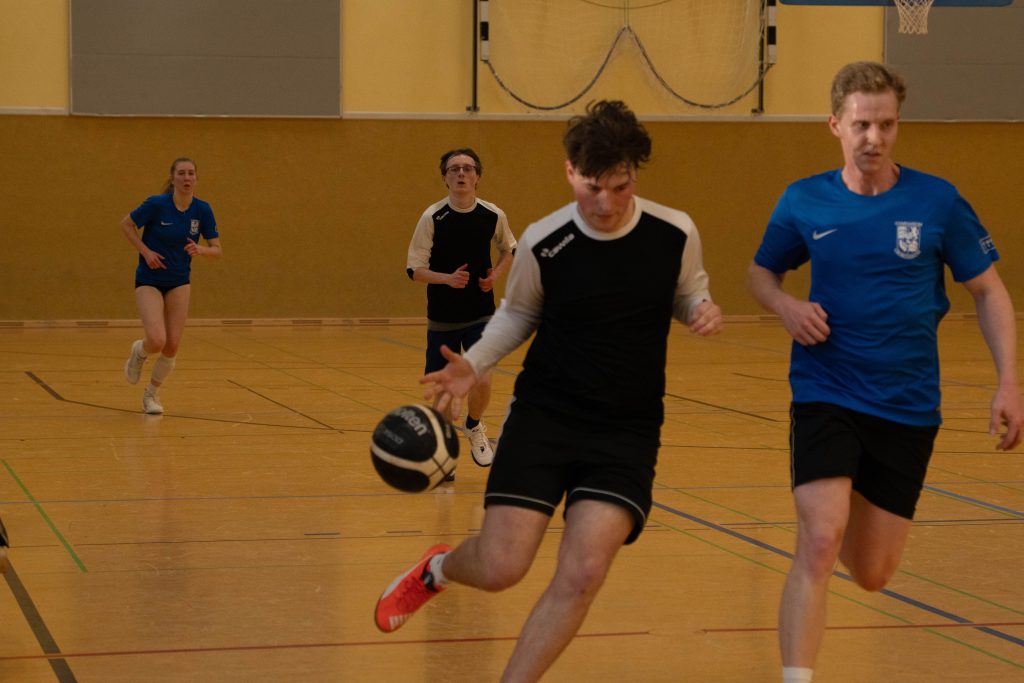 Im Fußball entwickelte sich ein ausgeglichenes Spiel. Mit Marcel Mentrup, Hanjo Vocks, Katharina Börger und Elias Hoffmann hatten die Lehrkräfte gleich vier starke Spieler in ihren Reihen. Und das machte sich bemerkbar. Immer wieder tauchten sie vor dem gegnerischen Tor gefährlich auf. Das Fortune fehlte an vielen Stellen. Entweder war der Pfosten oder ein letzter rettender Gegenspieler im Weg. Die Schüler:innen gingen durch die super Vorlage von Franz Vehring und den Torschuss von Greta Rohling etwas überraschend in Führung, doch Elias Hoffmann gelang der Ausgleich. Fast wäre dem starken Hoffmann der zweite Treffer gelungen. Doch sein Schuss, der im Tor landete, wurde von außerhalb der Neunmeterlinie erzielt. Das Spiel ging weiter und die Schülerin Greta erzielte erneut durch Vorlage von Franz ihr zweites Tor zum 2:1. Ein optimales Zusammenspiel der beiden, das die Schüler:innen letztendlich den glücklichen Sieg sicherte.