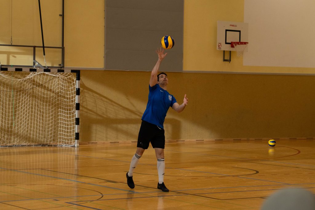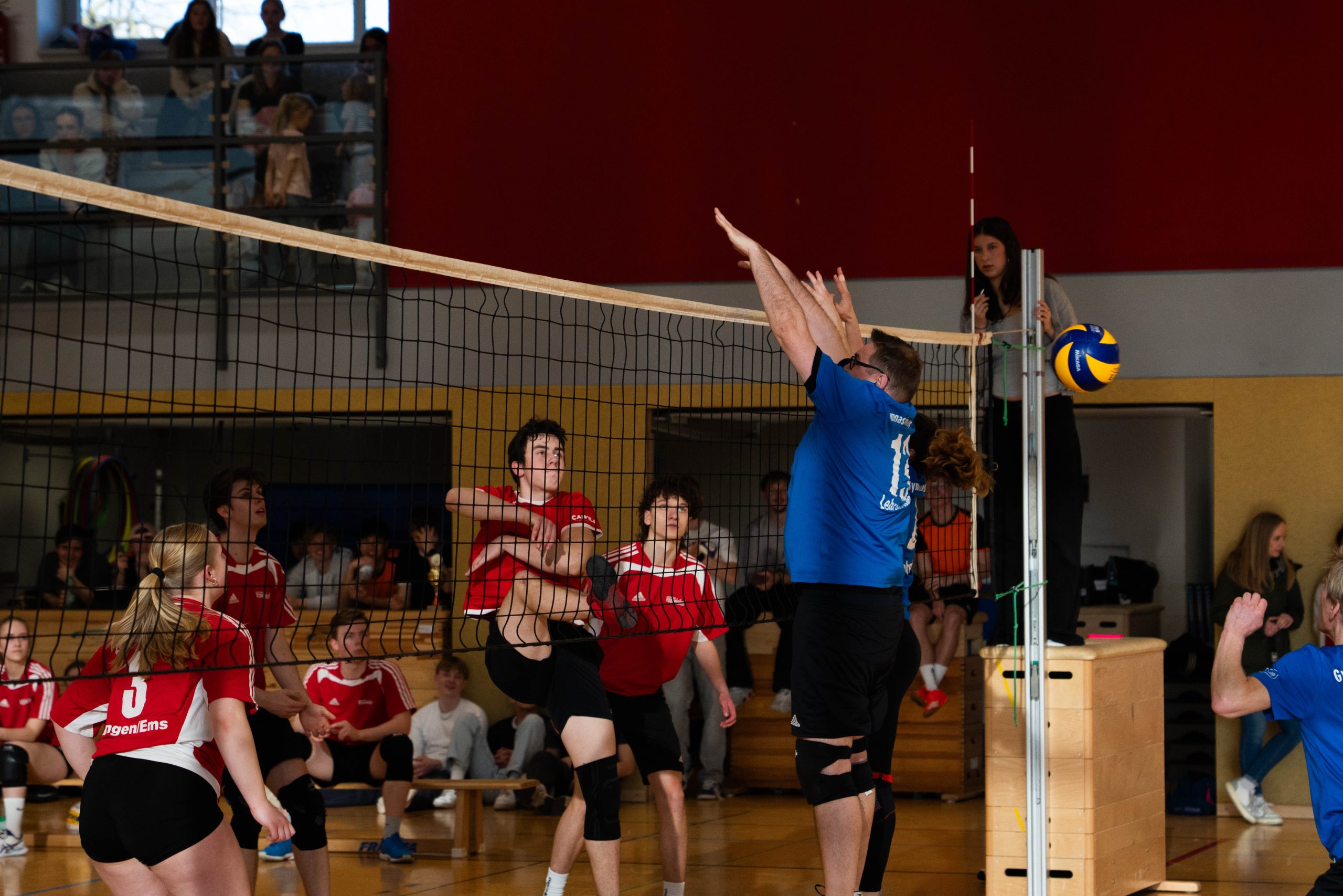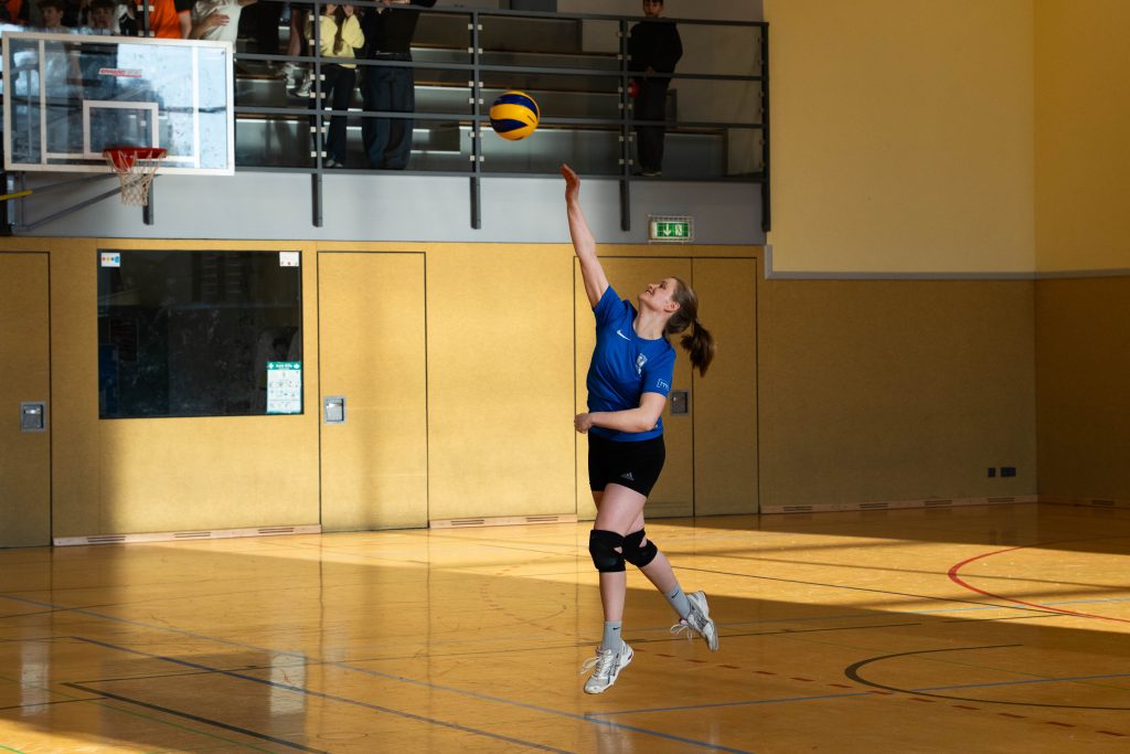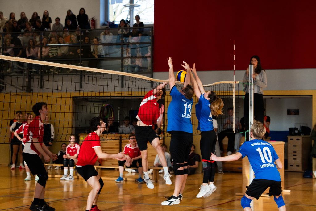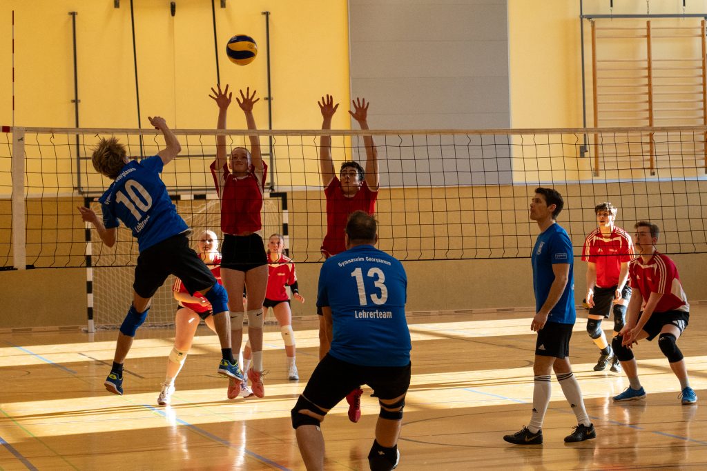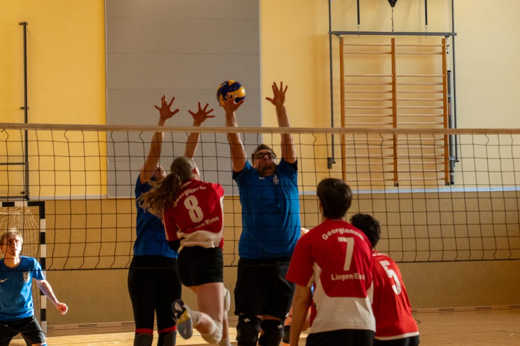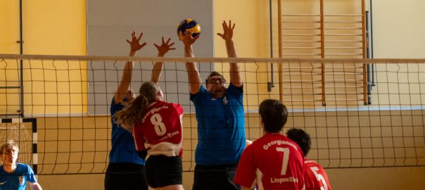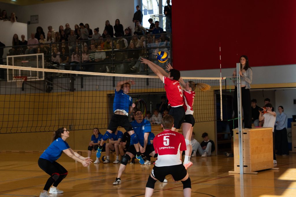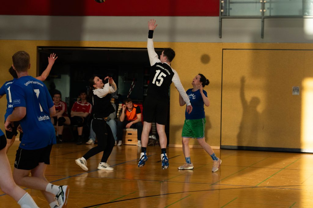 Im Volleyball sahen die knapp 150 Zuschauer ein Spiel auf sehr hohem Niveau. „Das haben wir so in den letzten 15 Jahren noch nicht erlebt“, sagte Glosemeyer. Denn die Qualität der Ballwechsel und die Atmosphäre begeisterten. „Das hat Spaß gemacht“, so Lehrer Henning Bach. Im ersten Satz zogen die Schüler:innen mit 14:9 davon. Doch dann kam Praktikantin Sarah Korte, die mit ihrer Aufschlagserie für Aufsehen sorgte. Die Spannung stieg. Auf 15:14 stellten die Lehrkräfte, konnten den ersten und einzigen Satzball nicht nutzen. Das 15:17 war aufgrund der überragenden Teamleistung der Schüler:innen nicht abzuwenden. Egal ob harte Aufschläge, gekonnte Defense oder Angriffsschläge auf höchstem Niveau: die „Schülis“ waren kaum zu stoppen. Im zweiten Satz siegten diese deutlicher mit 15:10 und feierten damit zurecht den Sieg.