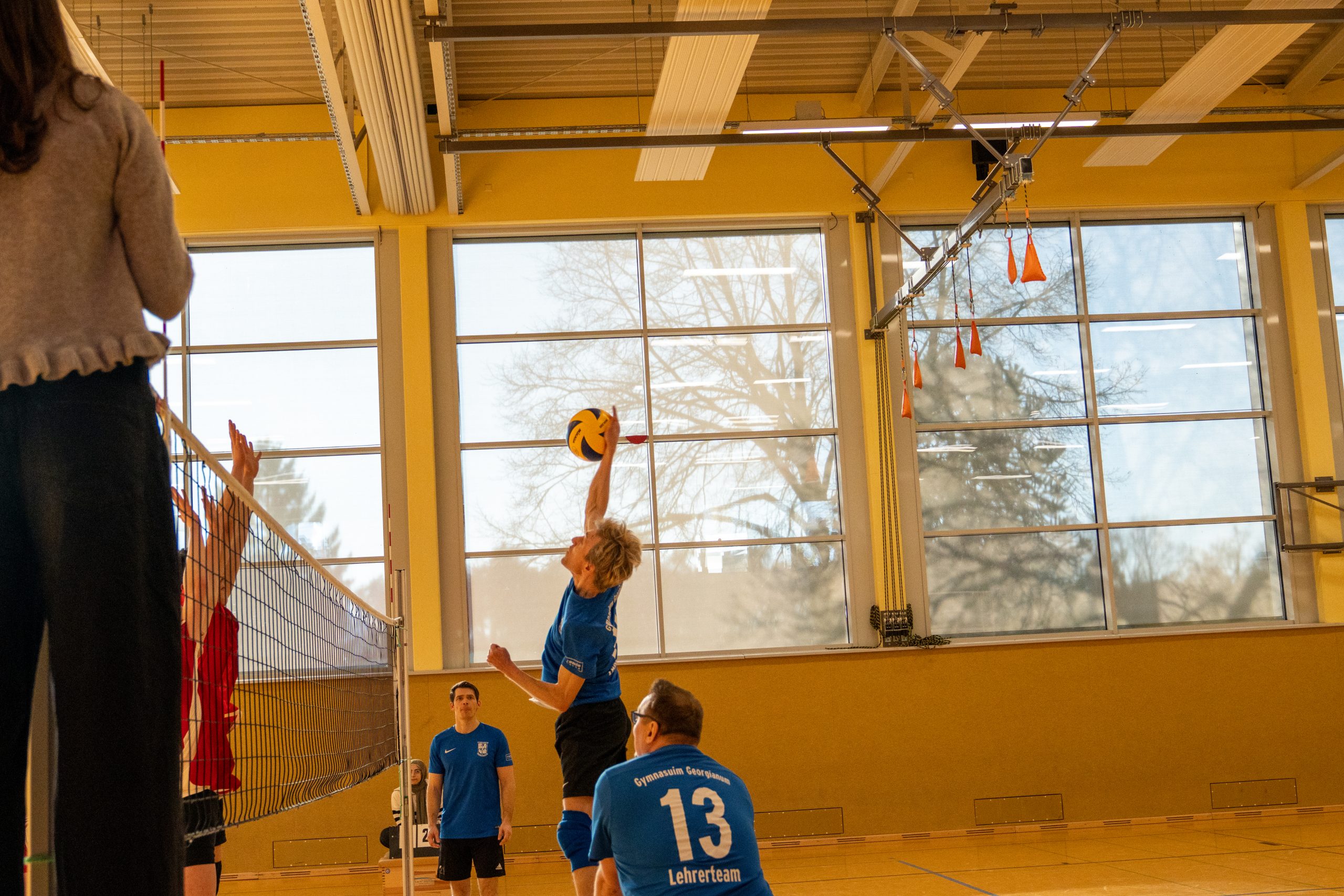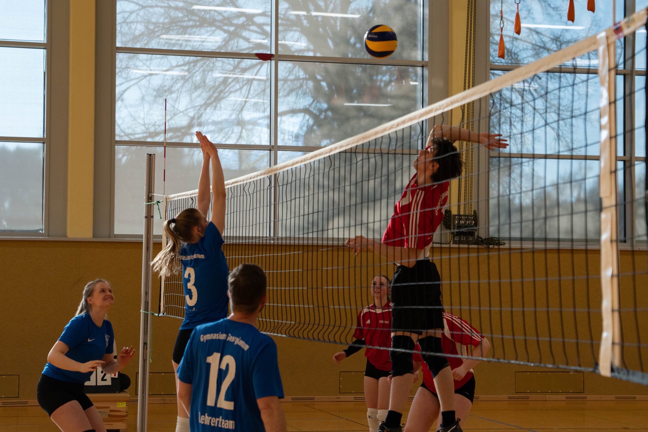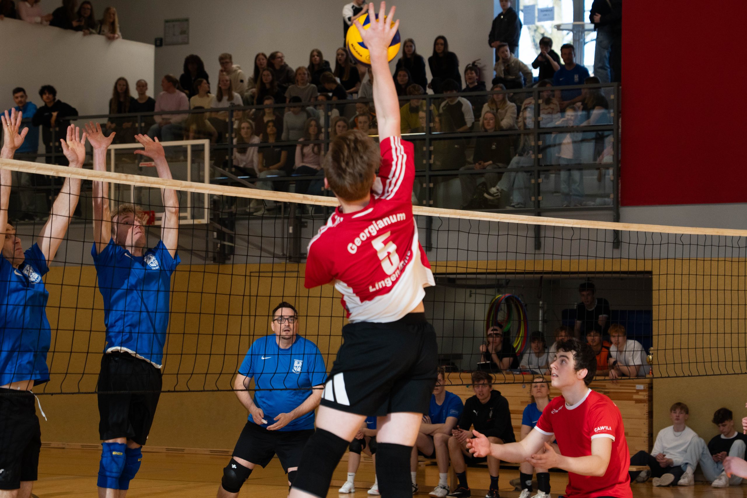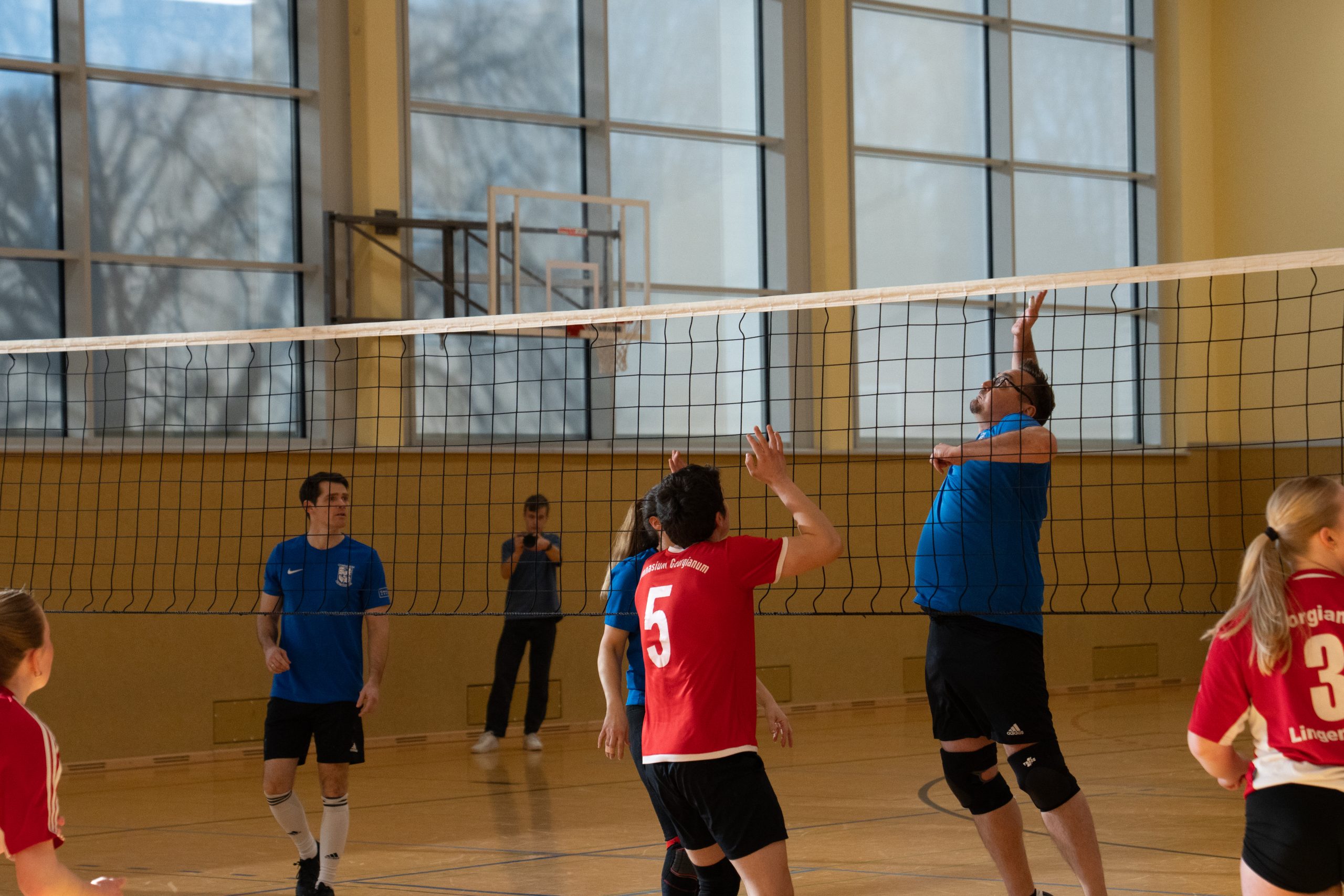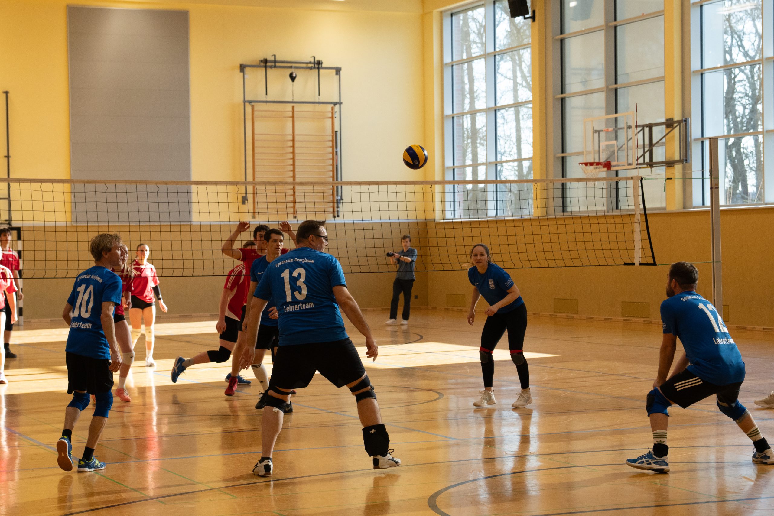 Im Volleyball sahen die knapp 150 Zuschauer ein Spiel auf sehr hohem Niveau. „Das haben wir so in den letzten 15 Jahren noch nicht erlebt“, sagte Glosemeyer. Denn die Qualität der Ballwechsel und die Atmosphäre begeisterten. „Das hat Spaß gemacht“, so Lehrer Henning Bach. Im ersten Satz zogen die Schüler:innen mit 14:9 davon. Doch dann kam Praktikantin Sarah Korte, die mit ihrer Aufschlagserie für Aufsehen sorgte. Die Spannung stieg. Auf 15:14 stellten die Lehrkräfte, konnten den ersten und einzigen Satzball nicht nutzen. Das 15:17 war aufgrund der überragenden Teamleistung der Schüler:innen nicht abzuwenden. Egal ob harte Aufschläge, gekonnte Defense oder Angriffsschläge auf höchstem Niveau: die „Schülis“ waren kaum zu stoppen. Im zweiten Satz siegten diese deutlicher mit 15:10 und feierten damit zurecht den Sieg.