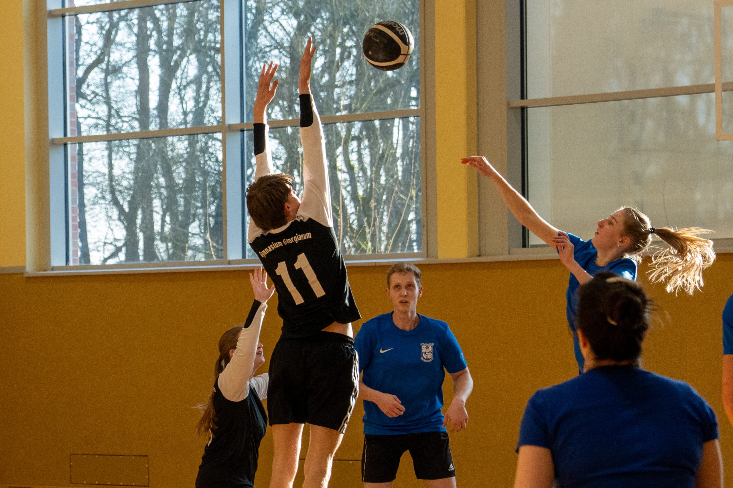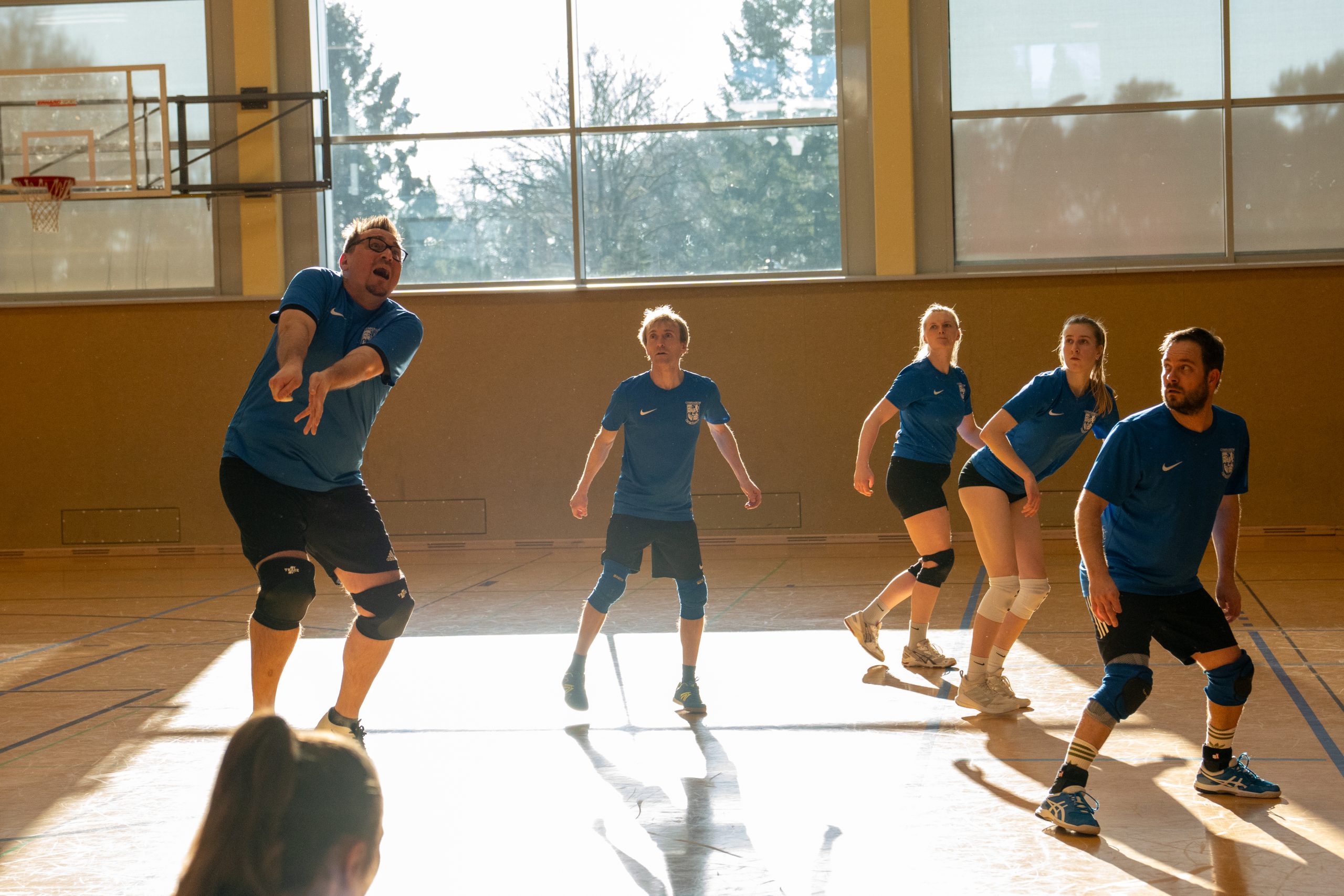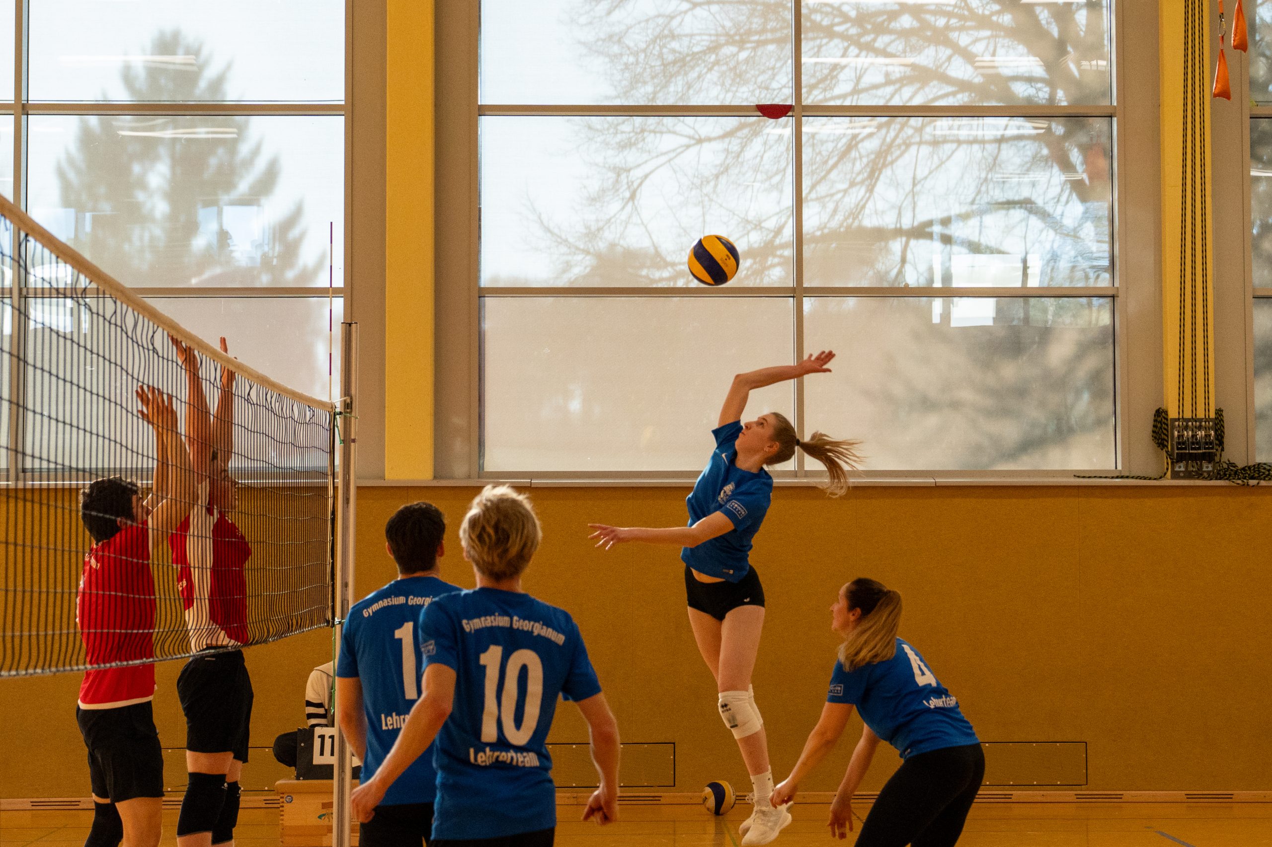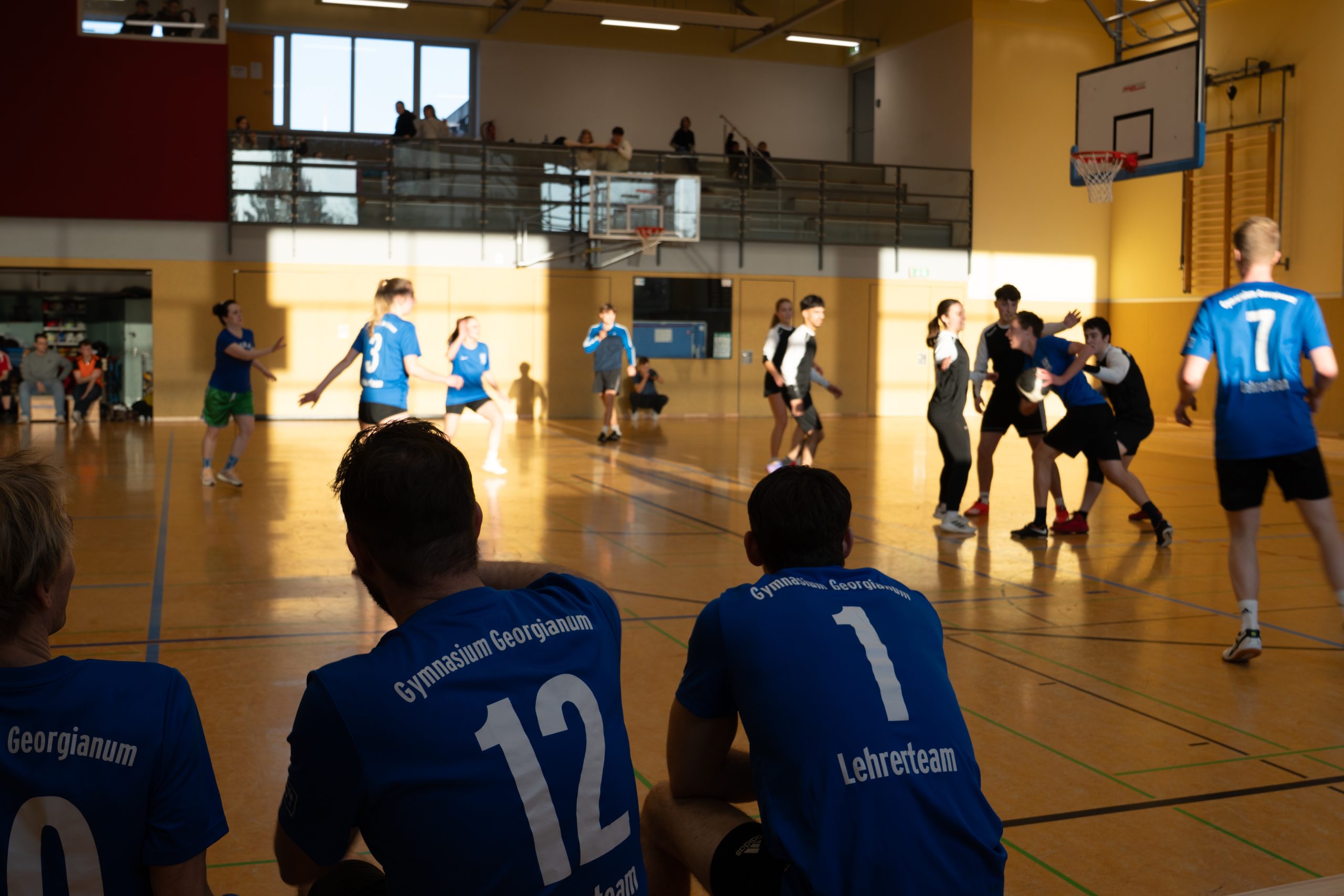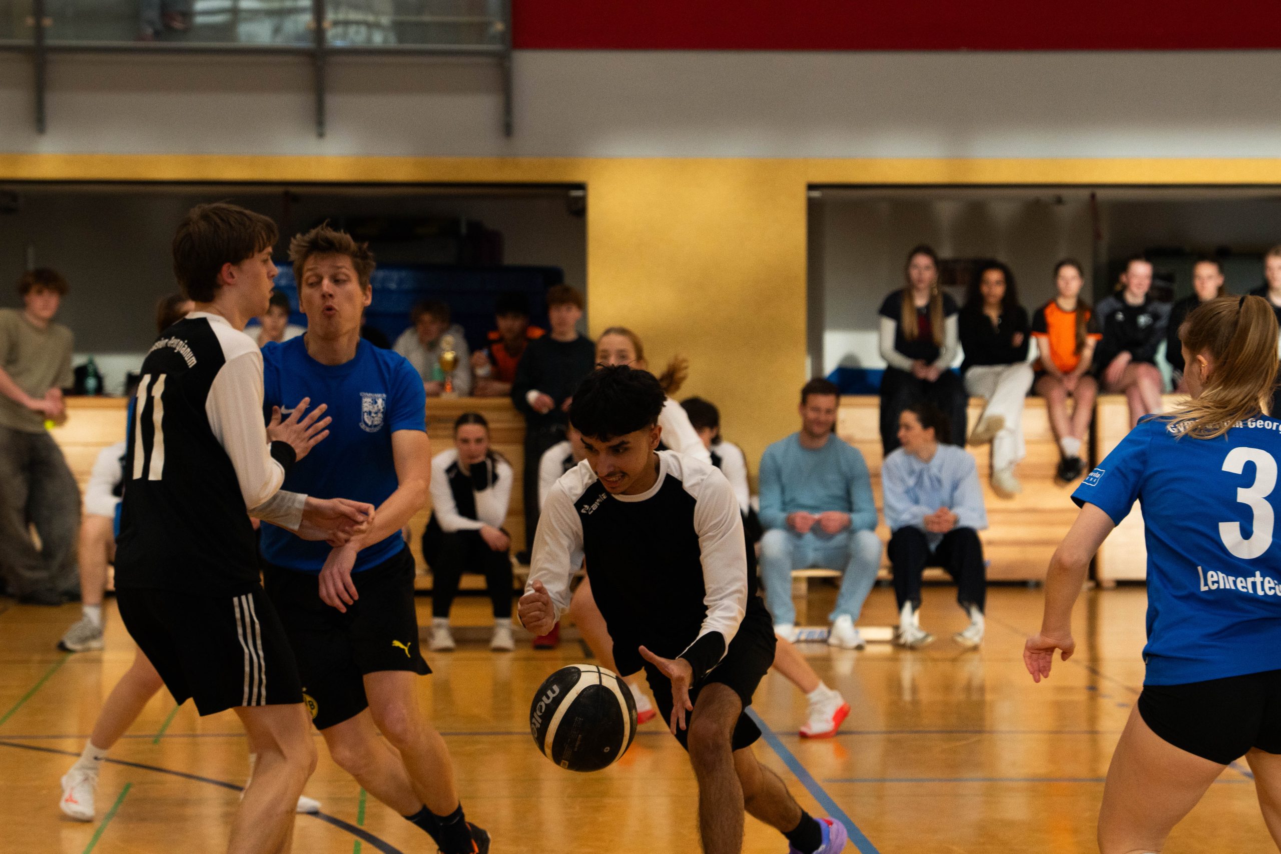Im Volleyball sahen die knapp 150 Zuschauer ein Spiel auf sehr hohem Niveau. „Das haben wir so in den letzten 15 Jahren noch nicht erlebt“, sagte Glosemeyer. Denn die Qualität der Ballwechsel und die Atmosphäre begeisterten. „Das hat Spaß gemacht“, so Lehrer Henning Bach. Im ersten Satz zogen die Schüler:innen mit 14:9 davon. Doch dann kam Praktikantin Sarah Korte, die mit ihrer Aufschlagserie für Aufsehen sorgte. Die Spannung stieg. Auf 15:14 stellten die Lehrkräfte, konnten den ersten und einzigen Satzball nicht nutzen. Das 15:17 war aufgrund der überragenden Teamleistung der Schüler:innen nicht abzuwenden. Egal ob harte Aufschläge, gekonnte Defense oder Angriffsschläge auf höchstem Niveau: die „Schülis“ waren kaum zu stoppen. Im zweiten Satz siegten diese deutlicher mit 15:10 und feierten damit zurecht den Sieg.
