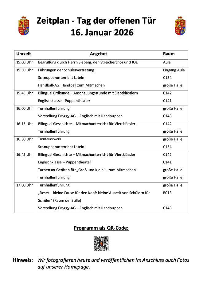 Tag der offenen Tür am 16. Januar 2026 8. Januar 2026AktuellesStefan RotersDas Gymnasium Georgianum präsentiert sich im Rahmen des Tages der offenen Tür am 16.01.26. Viele Highlights erwarten dort die Gäste.Die wichtigsten Information gibt es hier zum Download:Programmgestaltung (PDF)Raumplan (PDF)Anmeldeformular für die Klasse 5 (PDF)